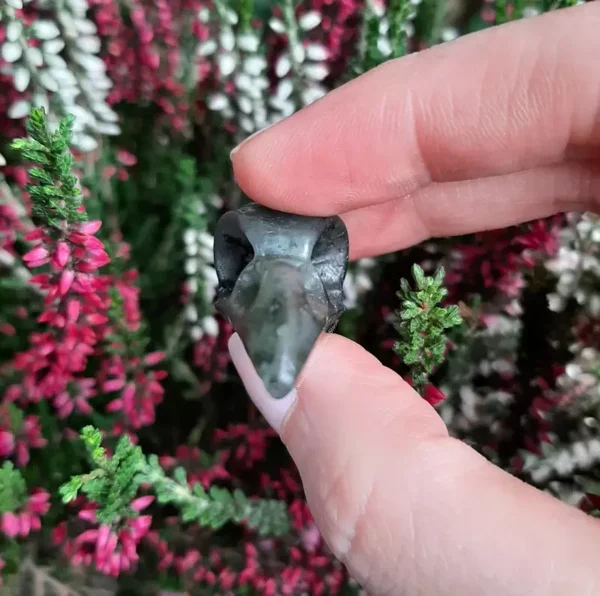 Prachtige raaf schedeltje gemaakt uit labradoriet. Dit schedeltje heeft een schitterende blauwe flash op zijn hoofdje.