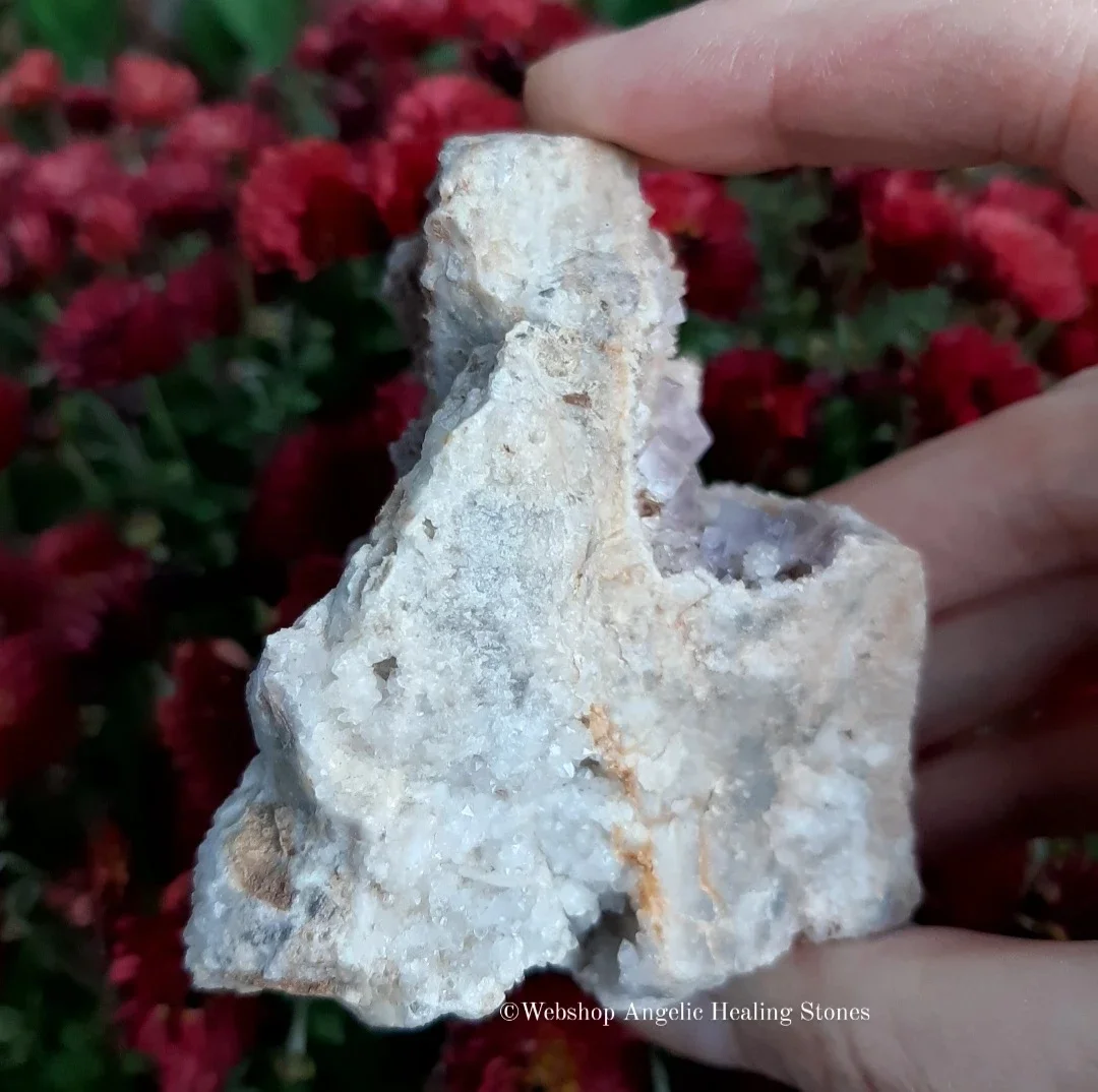 Een bijzonder en schitterend geode stuk met een opening die gevuld is met prachtige lavendelkleurige fluoriet. Op de zijkant en achterkant is mooie glinsterende kwarts te zien en nog een verdwaald fluoriet kubusje en als je goed kijkt, zie je ook nog een klein bariet plaatje.