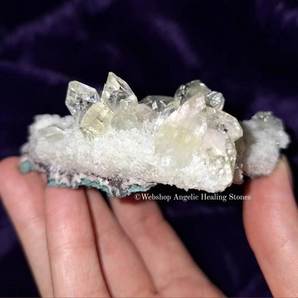 🧧Bijzonderheden: Dit is een liggend stuk. In een Apofylliet punt zit een beetje calciet die op uv-licht reageert, supergaaf om te zien.