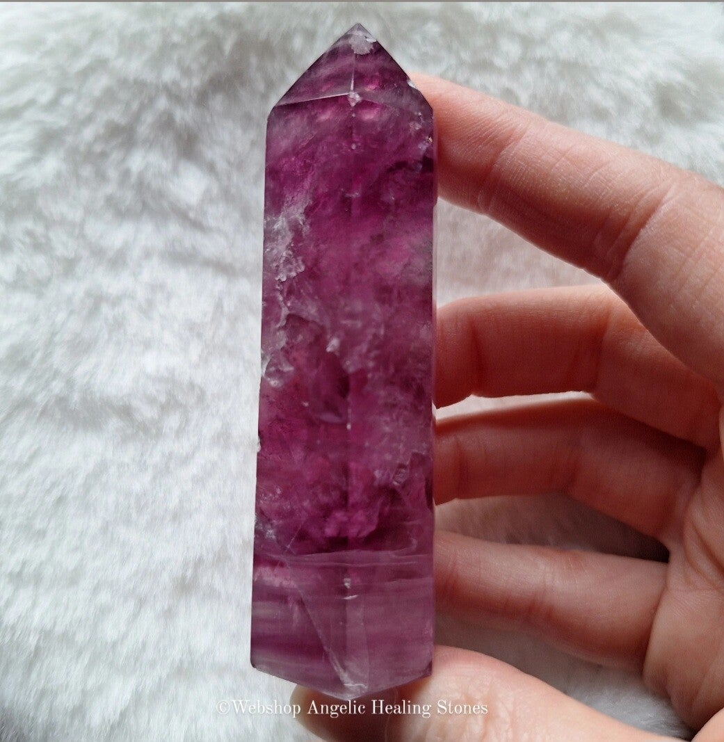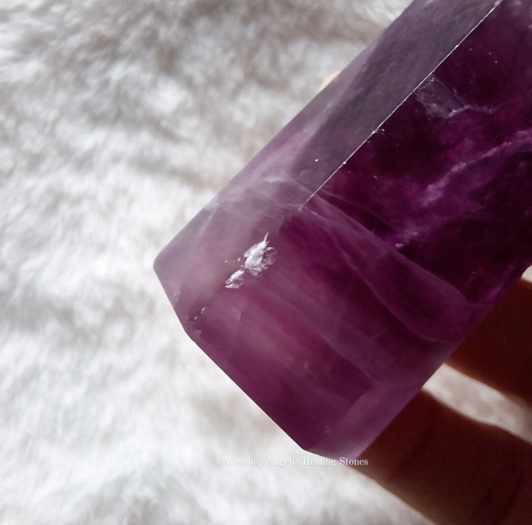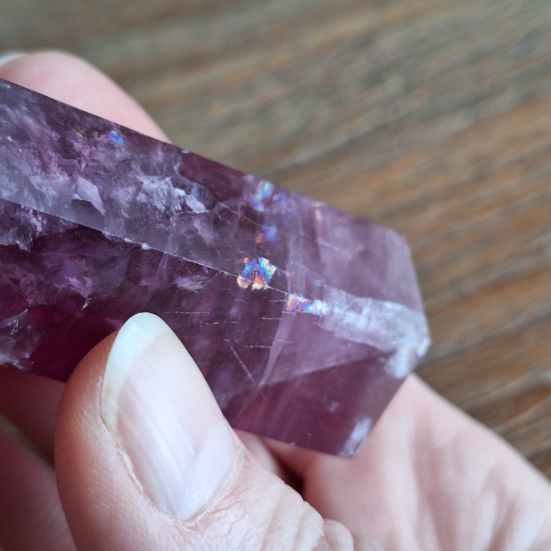 Mooie Fluoriet punt met de zeldzame magenta kleur. Ook heeft deze fluoriet punt kleurrijke regenboogjes.