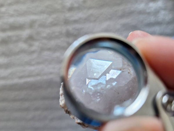 Deze kwartscluster uit Grube Clara is klein van stuk maar groots in detail. De heldere kristallen zijn mooi gevormd en vertonen bij nadere inspectie een bijzondere trapezoëdrische groei – een zeldzame kristalvorm waarbij de vlakken op een karakteristieke manier naar binnen hellen. Met een loepje zijn deze structuren prachtig te bewonderen.