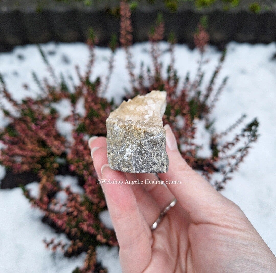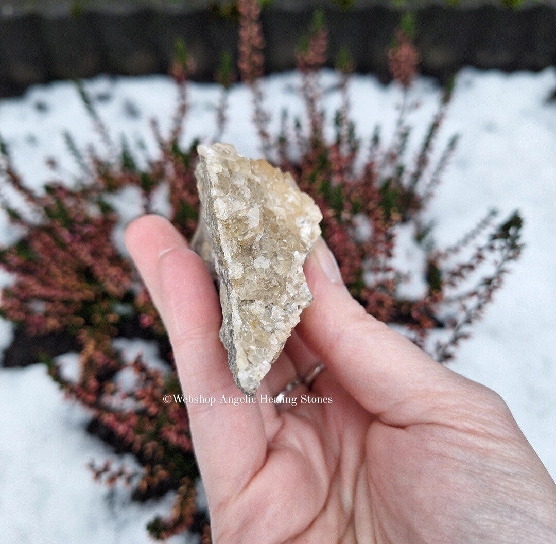 Calciet stukje met helder gele calciet kristallen die mooi reageren op UV-licht.