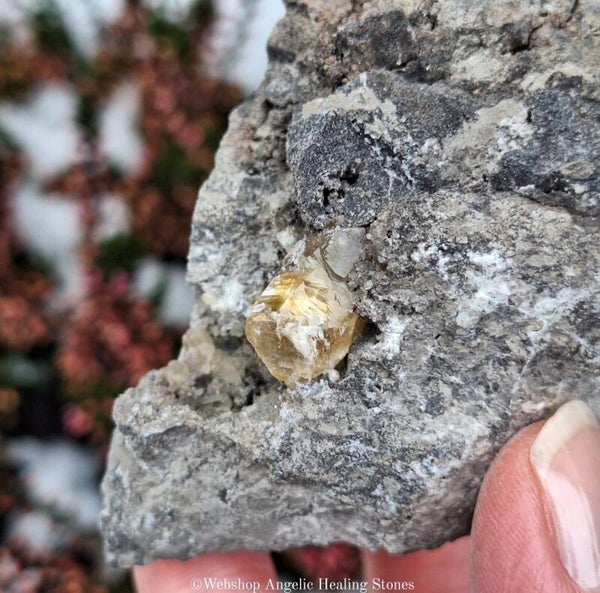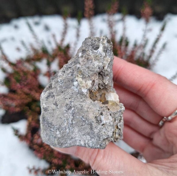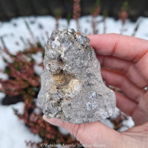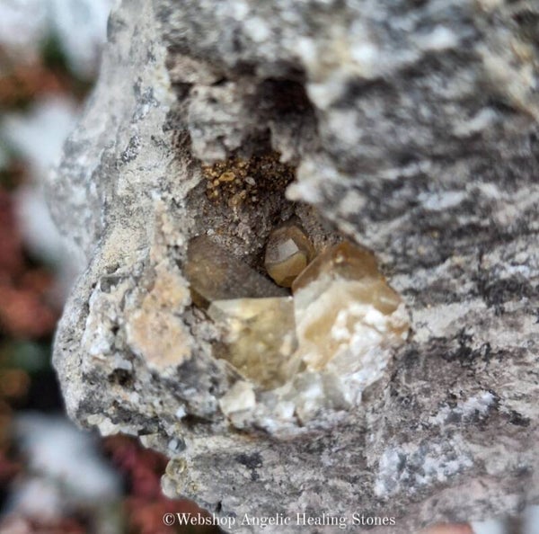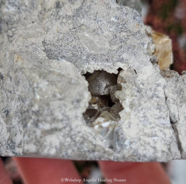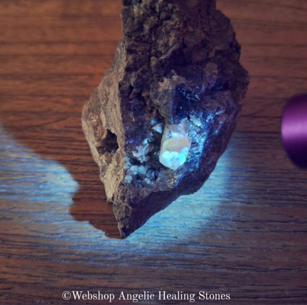 Calciet in matrix van kalksteen/dolomiet heeft twee openingen, in de openingen vind je calciet die laat zien hoe de calciet in de kalksteen/dolomiet groeit. Leuk stuk die op UV-licht reageert.