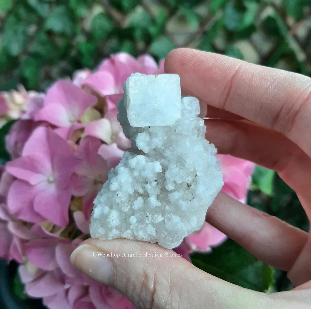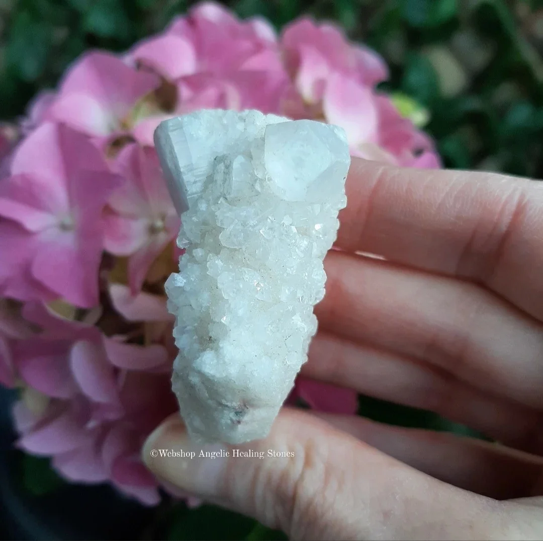 Leuke druzy kwarts cluster met een schitterende grote apofylliet kubus en kristal.
