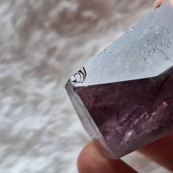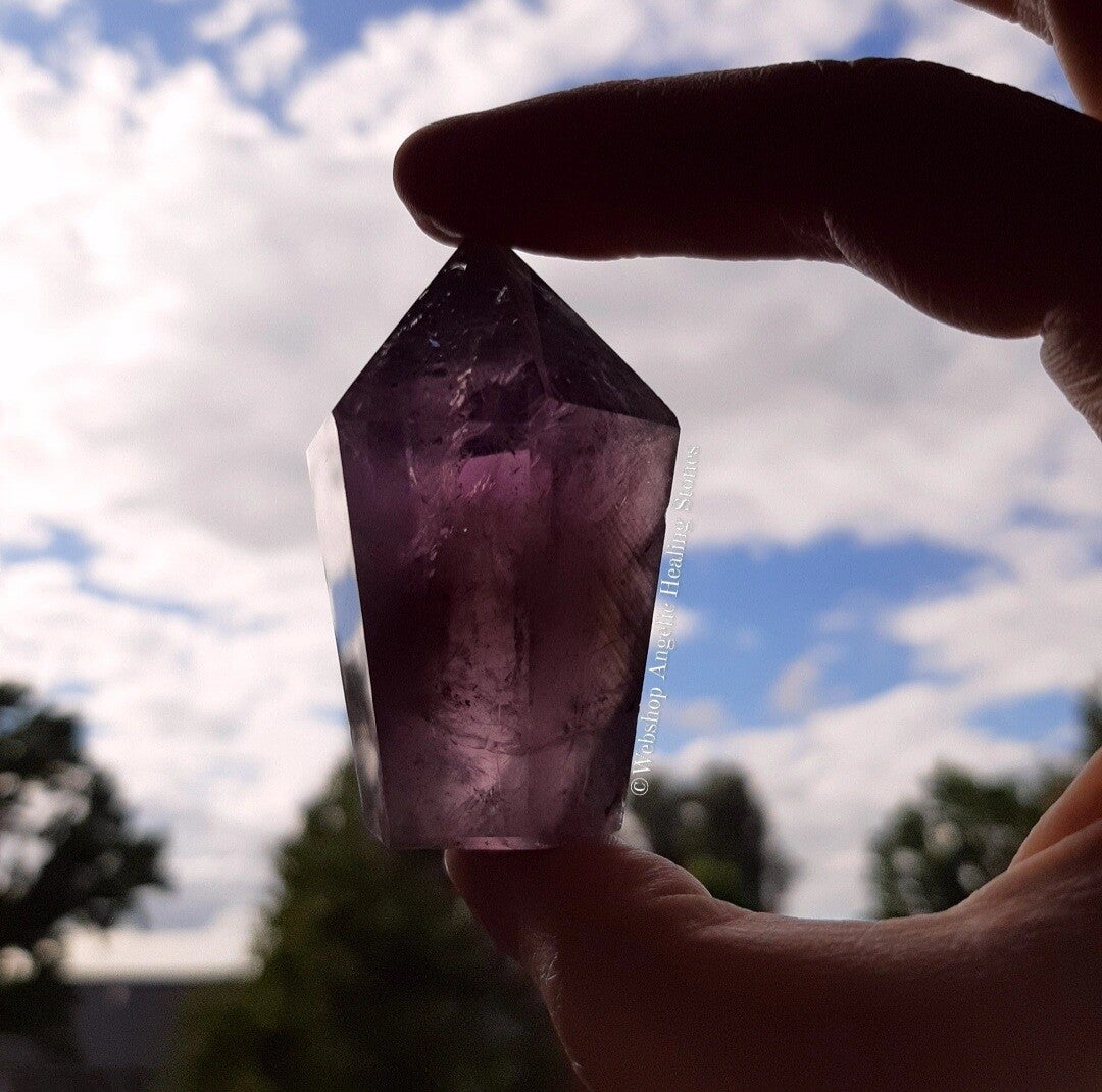 Prachtige donkerpaarse ametrien punt met kleine regenboogjes.